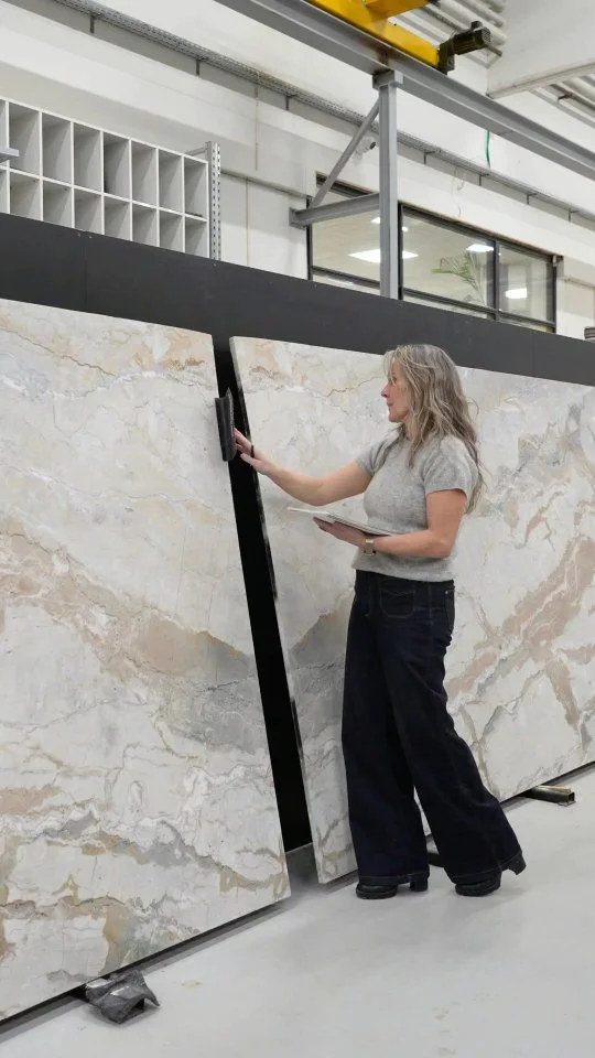 Hos Kvänum i Lyngby står nu et køkken, hvor årene i stenen fortsætter fra bordpladen op i en markant backsplash, der danner et smukt bagtæppe for de mørke træfronter og vitriner. Stenvalget er faldet på den smukke Opera Fantastico – nøje udvalgt for sin struktur og balance – og resultatet er et roligt, men karakterfuldt udtryk, der lader årene flyde fra væggen og ned i bordpladen.